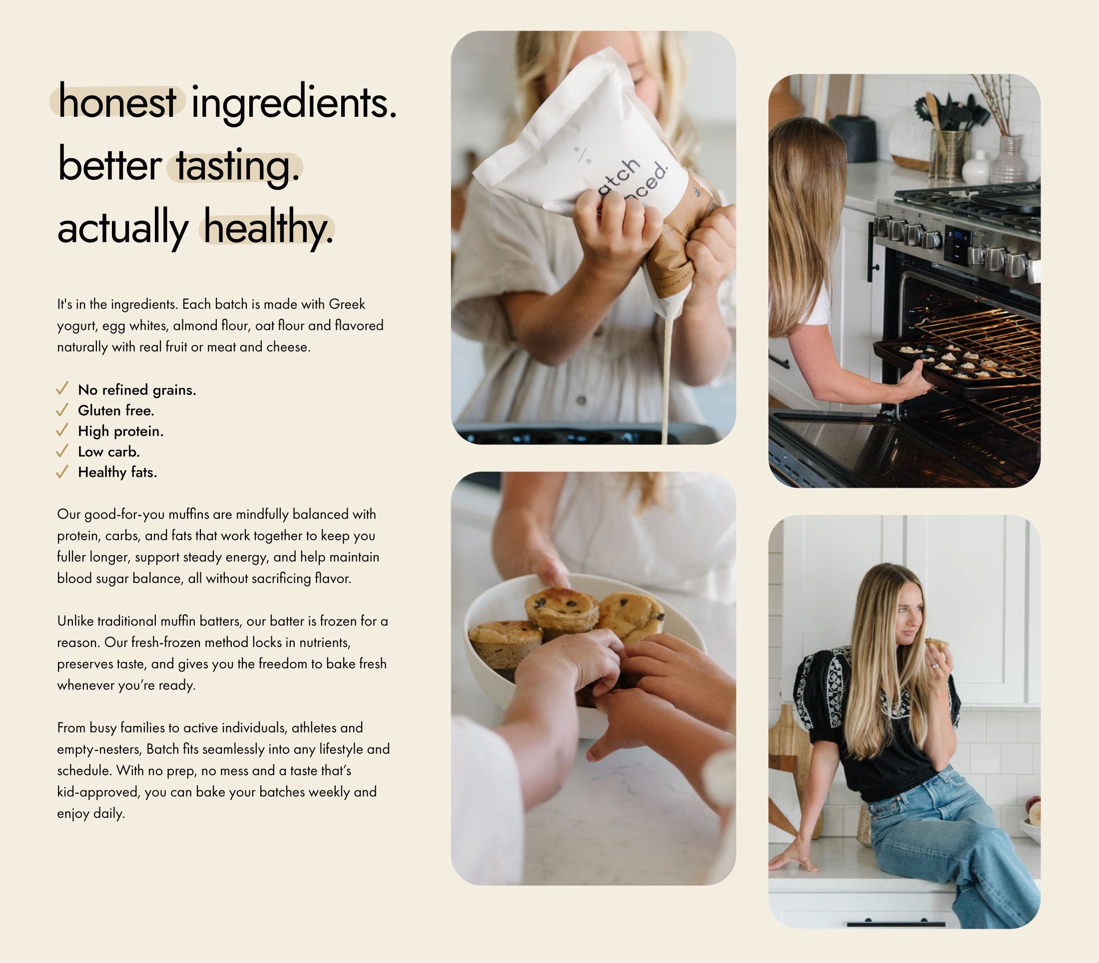 Batch began in my home kitchen as a simple way to feed my family real food that tasted good and made us feel our best. After nearly being diagnosed with an autoimmune disorder in my 20s, I learned how much balanced nutrition impacts energy, hormones, and overall health. So I started creating high-protein muffins with wholesome ingredients to support blood sugar balance and make healthy eating easy even on our busiest days.