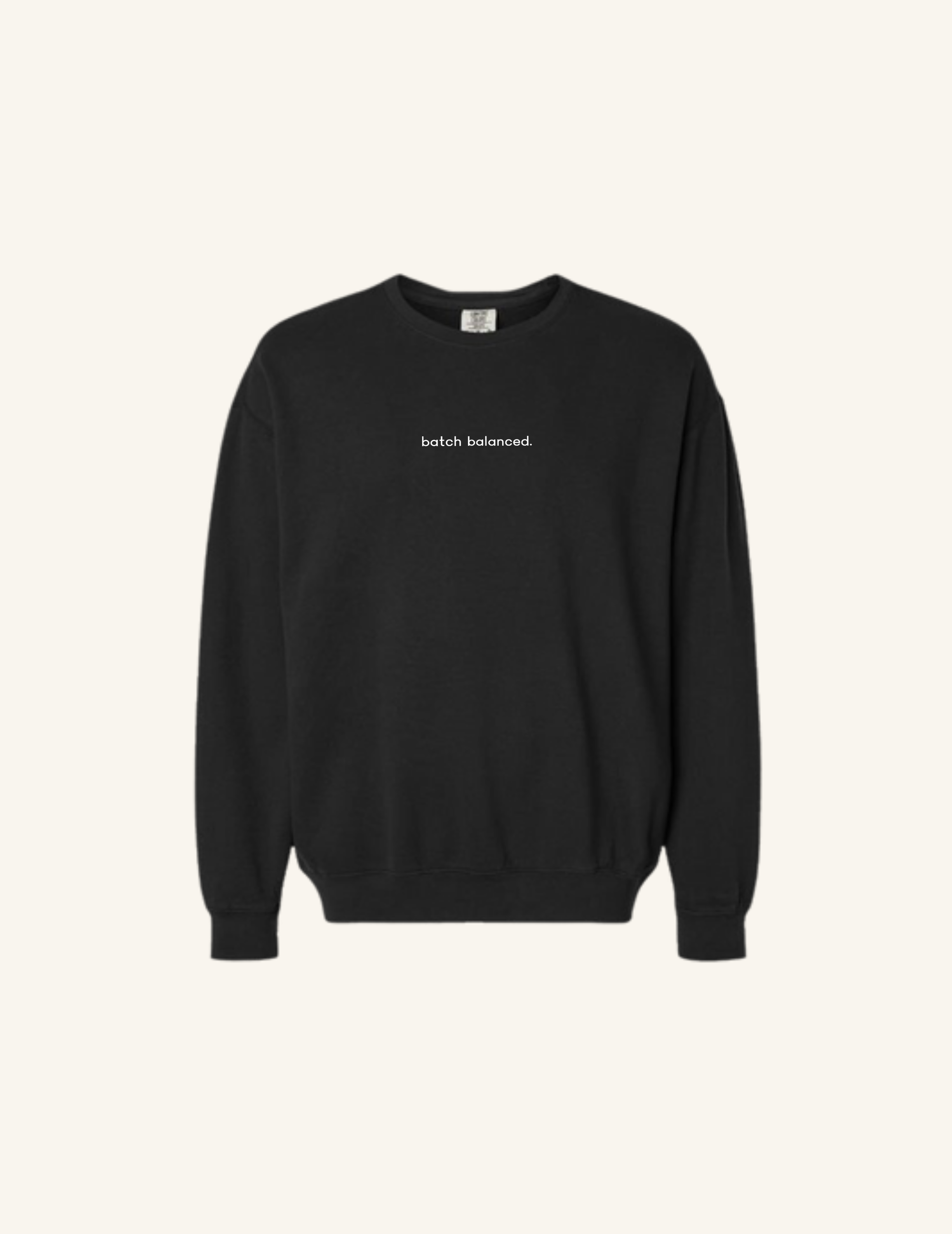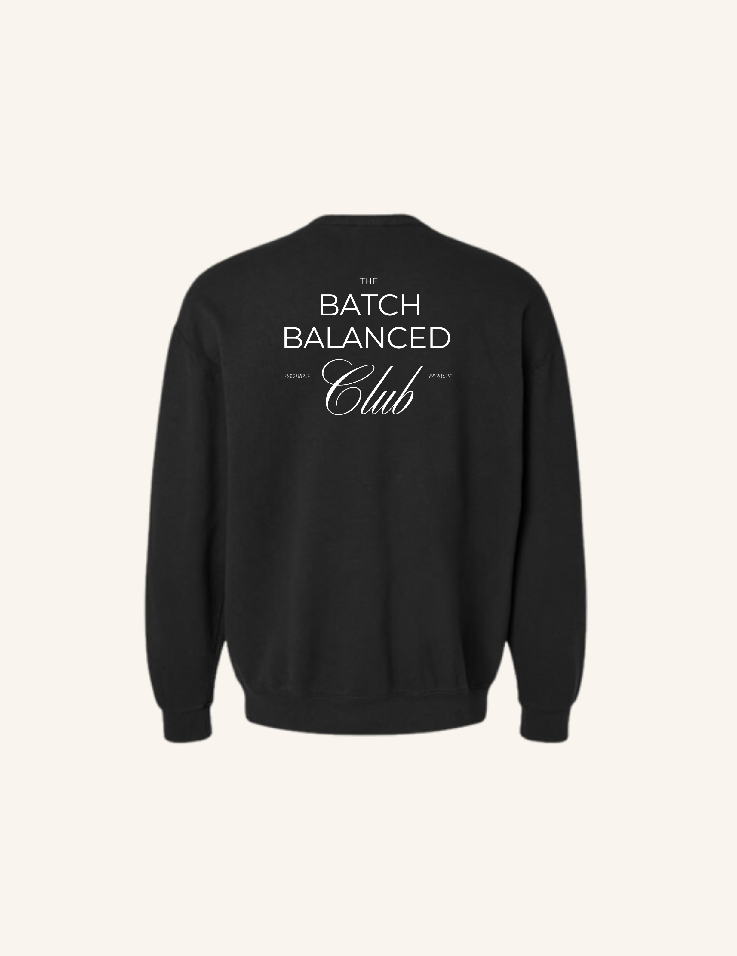 This black Comfort Colors crew features Batch Balanced on the front and The Batch Balanced Club on the back — a nod to the community that keeps showing up, fueling up, and living life well-balanced.
